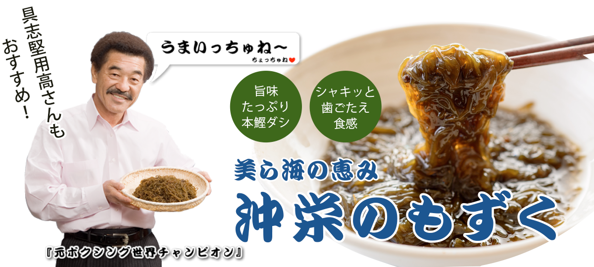 沖栄フーズのもずくは、沖縄のサンサンと輝く太陽と透き通る海で育ちミネラルがたっぷり含まれており、しかも低カロリー。できるだけ本来の味をお届けすること、新鮮で混じり気のない美味しさをお届けします。皆さまに必ず納得いただける商品を目指しております。