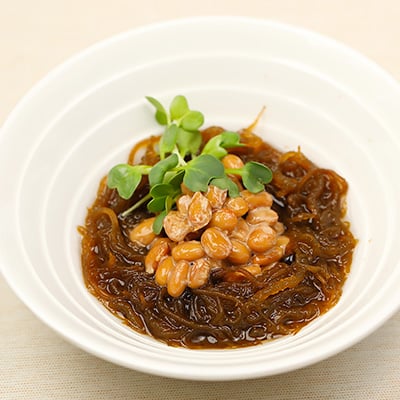 器に味付けもずく、納豆、カイワレを盛り付けて、出来上がり。